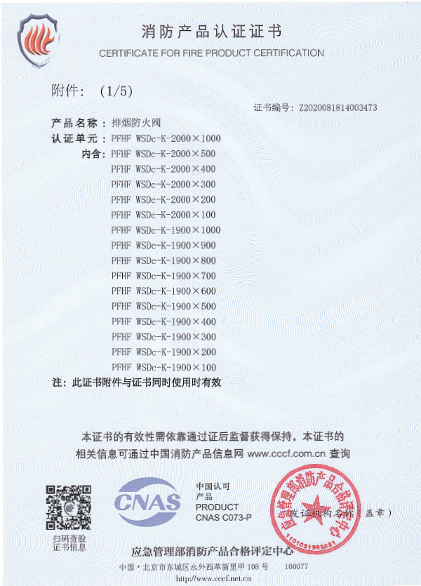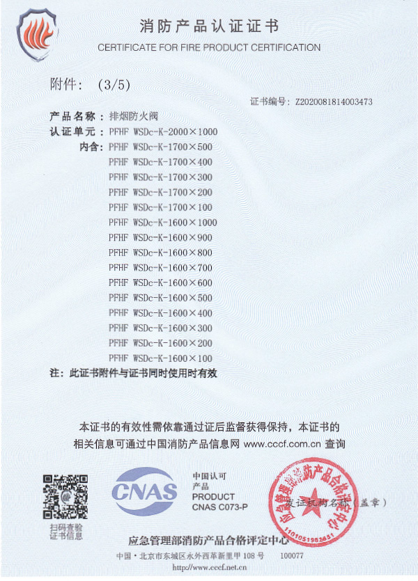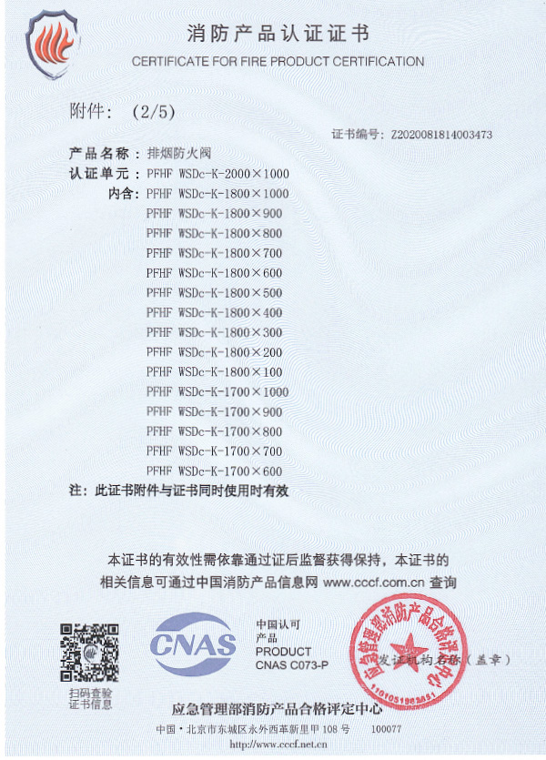 排煙防火閥認(rèn)證證書2000X1000